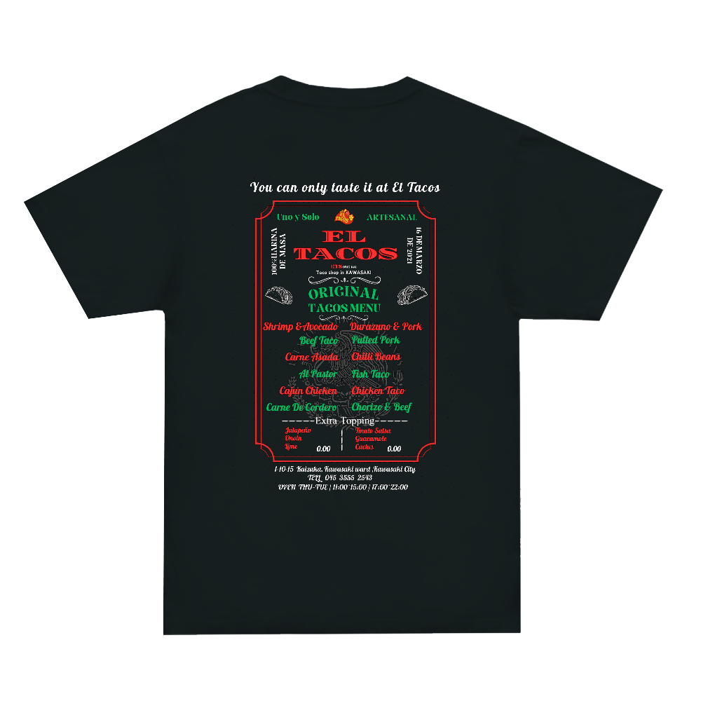 エルタコスのタコスのメニューをモチーフにしたデザイン。 バックにタコスのメニューがプリントされています。色はブラック